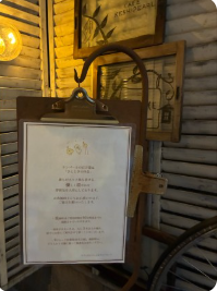 そこのお店のコンセプトは、誰もがホッと落ち着ける、優しく穏やかな雰囲気を大切にしているので、間接照明の落ち着いた雰囲気の店内に、優しい落ち着いた空間のお店です。